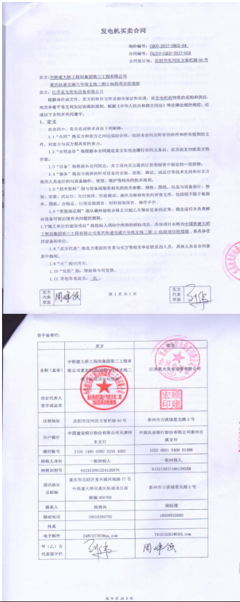 江蘇星光發(fā)電設(shè)備有限公司與中鐵建大橋工程局集團第三工程有限公司簽訂了400KW移動式柴油發(fā)電機組采購合同,該發(fā)電機組用于重慶軌道交通六號線支線二期2標段項目施工中。發(fā)電機組已于2017年12月中旬到達項目現(xiàn)場,等待調(diào)試完成后正式投入使..