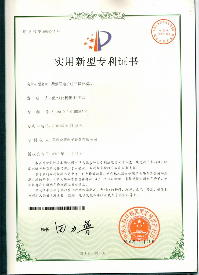 柴油發(fā)電機(jī)組三保護(hù)模塊-專利證書