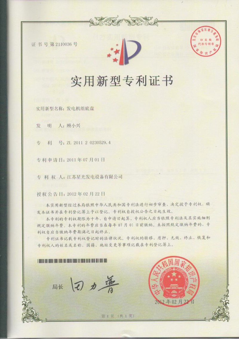 發(fā)電機(jī)組底盤-專利證書