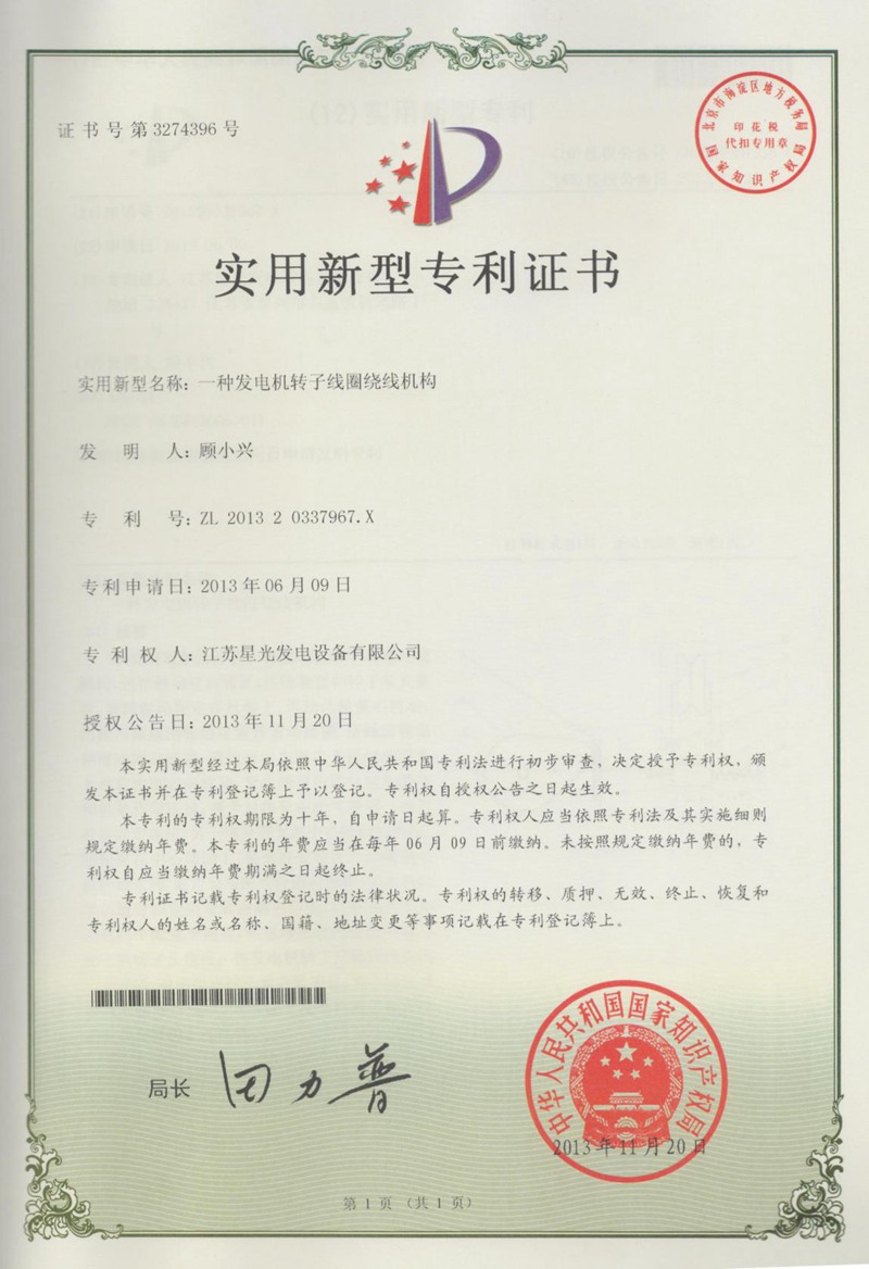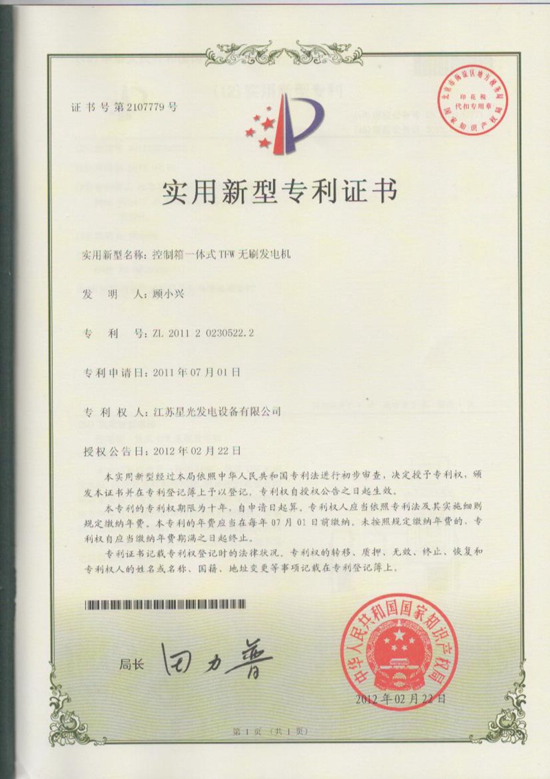 控制箱一體式TFW 無刷發(fā)電機(jī)-專利證書
